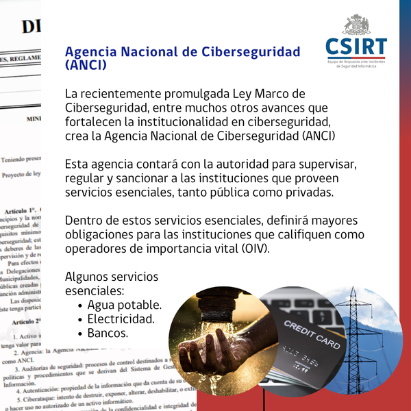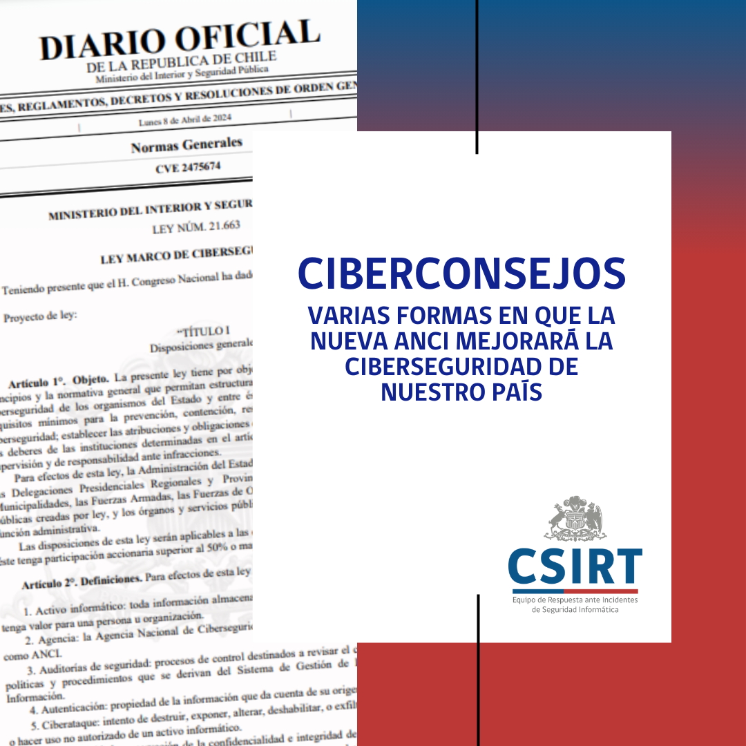 La recientemente promulgada Ley Marco de Ciberseguridad (https://csirt.gob.cl/ciberconsejos/ciberconsejos-ley-marco-de-ciberseguridad) crea una nueva institucionalidad de la ciberseguridad, la que nos permitirá estar más protegidos como país.