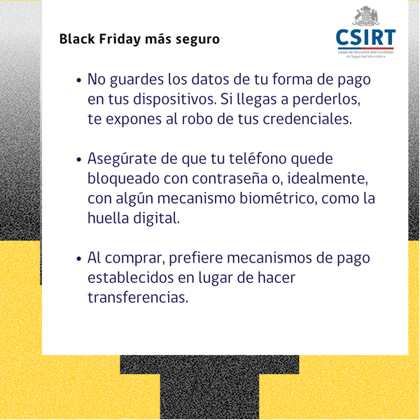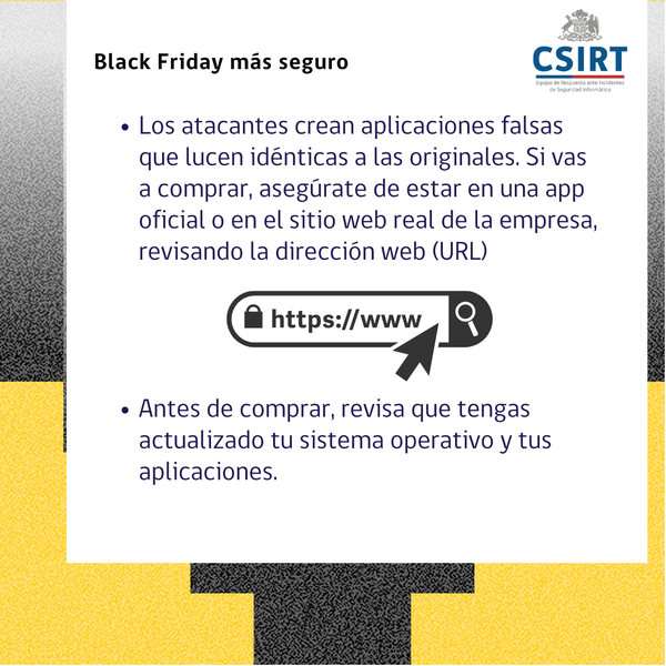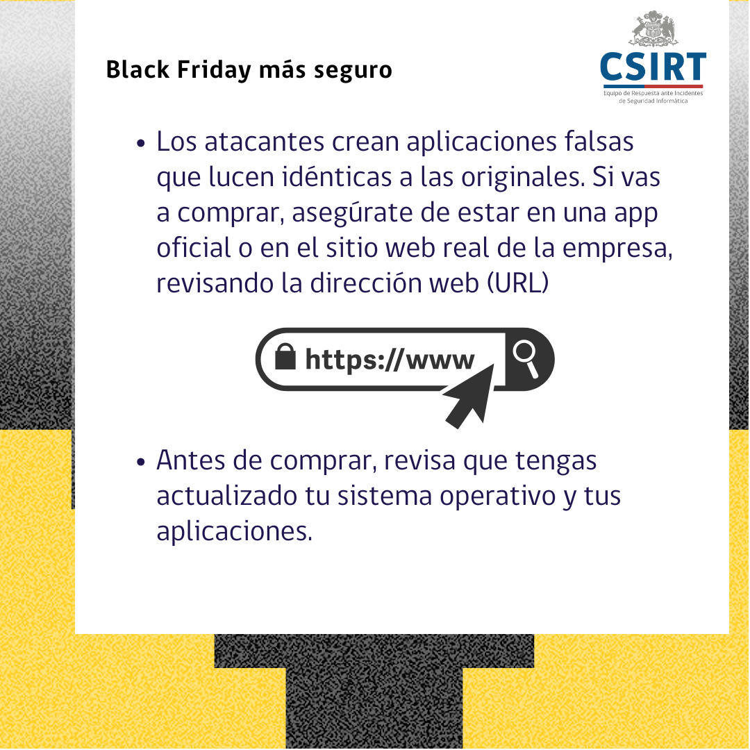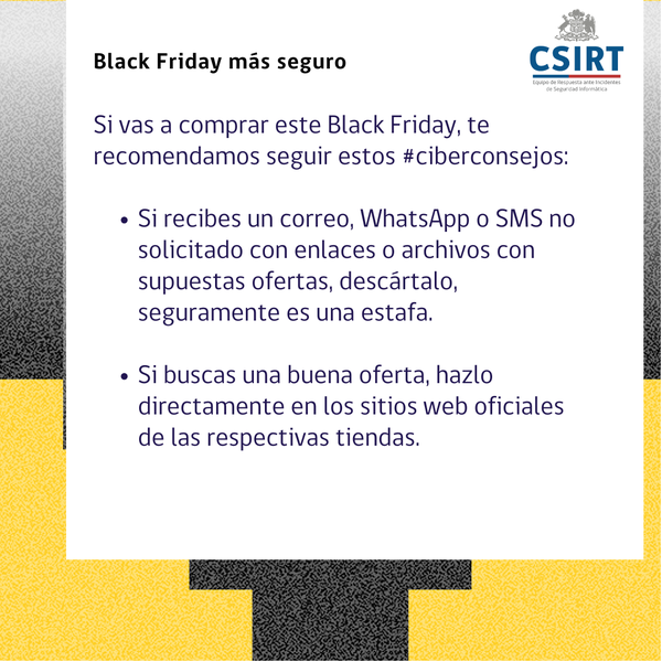 Si vas a comprar este Black Friday, te recomendamos seguir los siguientes Ciberconsejos, para poder aprovechar ofertas con mayor seguridad. En esta misma página también encontrarás un PDF para descargar e imprimir.
