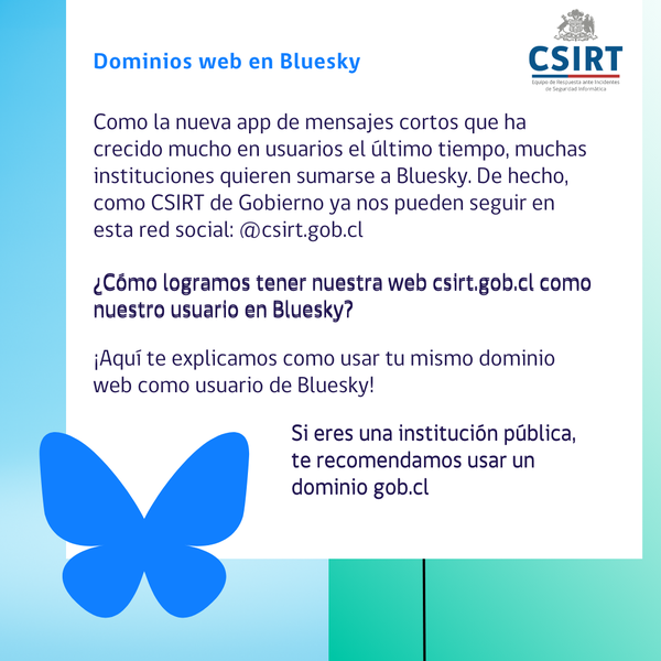 Como la nueva app de mensajes cortos que ha crecido mucho en usuarios el último tiempo, muchas instituciones quieren sumarse a Bluesky. De hecho, como CSIRT de Gobierno ya nos pueden seguir en esta red social: @csirt.gob.cl