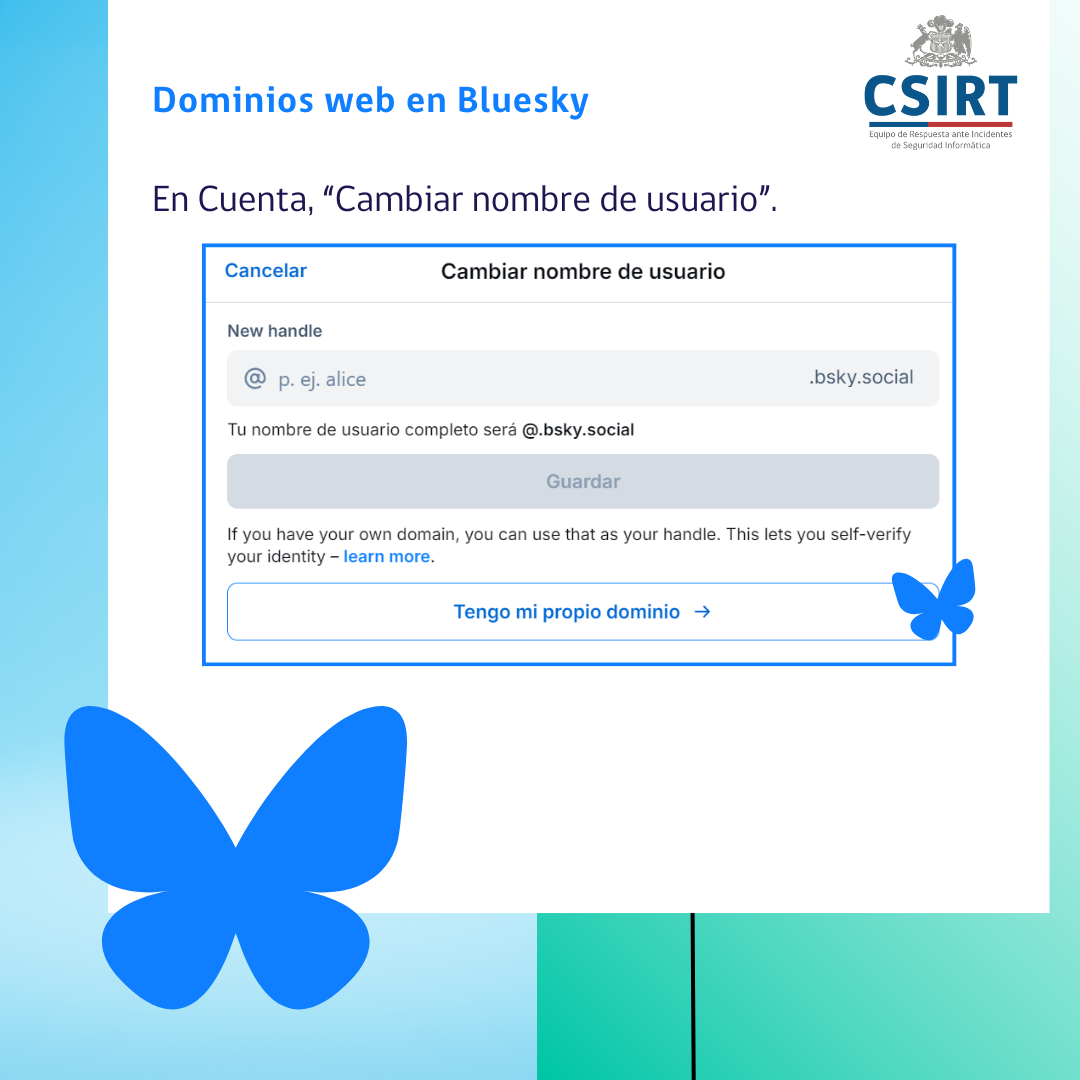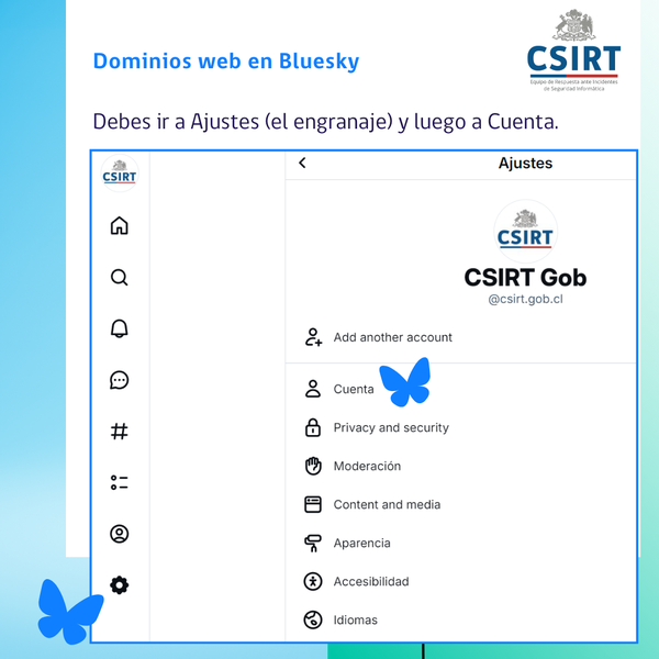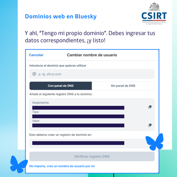 ¿Cómo logramos tener nuestra web csirt.gob.cl como nuestro usuario en Bluesky? ¿Cómo puedes usar tu dominio en tu propio usuario? Aquí te lo mostramos, en imágenes y también como documento PDF.