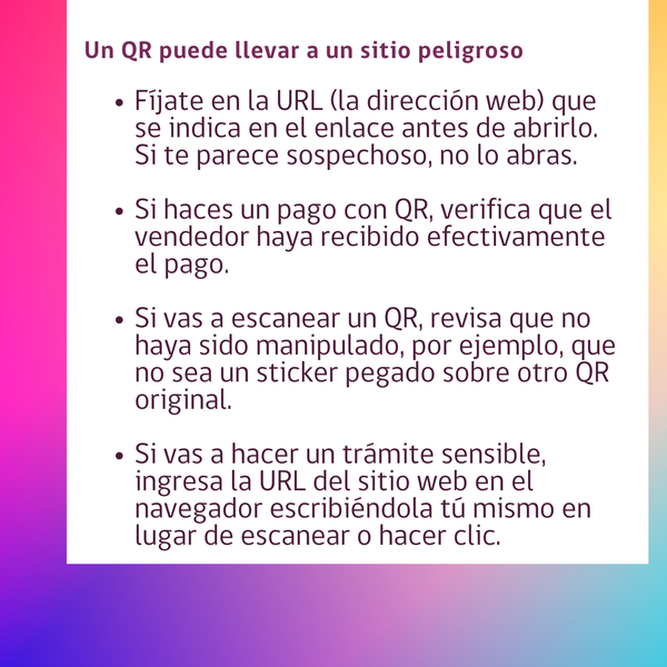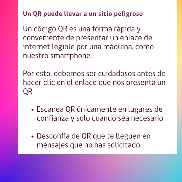 Los códigos QR son una forma fácil de acceder a un sitio web o una aplicación desde el teléfono. Pero esta misma comodidad de uso nos puede hacer olvidar que al escanear un QR, y abrir el enlace que nos entrega, corremos los mismos riesgos que al enfrentarnos a un link desconocido.