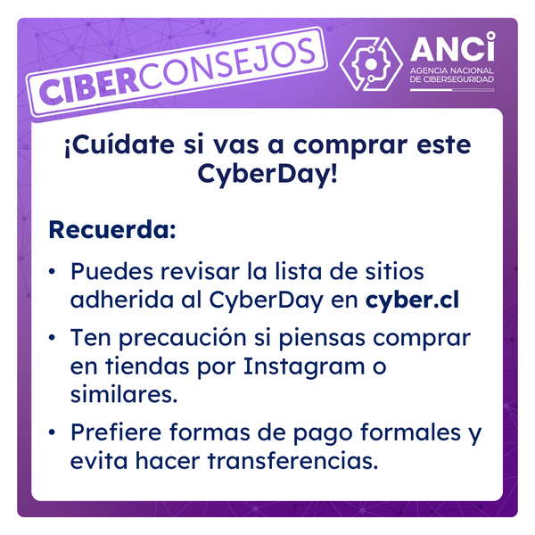 Ante la convocatoria de un nuevo CyberDay para el 6, 7 y 8 de octubre, por parte de la Cámara de Comercio de Santiago (CCS), en la Agencia Nacional de Ciberseguridad (ANCI) decidimos recordar nuevamente algunas precauciones fundamentales que es necesario tener, si se decide comprar en línea, para hacerlo de forma más segura.