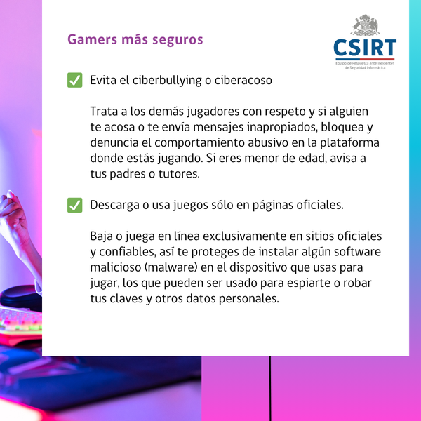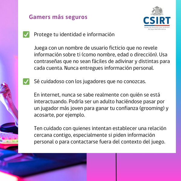 ¿Cómo jugar más seguros en línea? Con las siguientes recomendaciones que el CSIRT de Gobierno trae para todos quienes gustan de los videojuegos y pueden ser considerados "gamers", en su día.