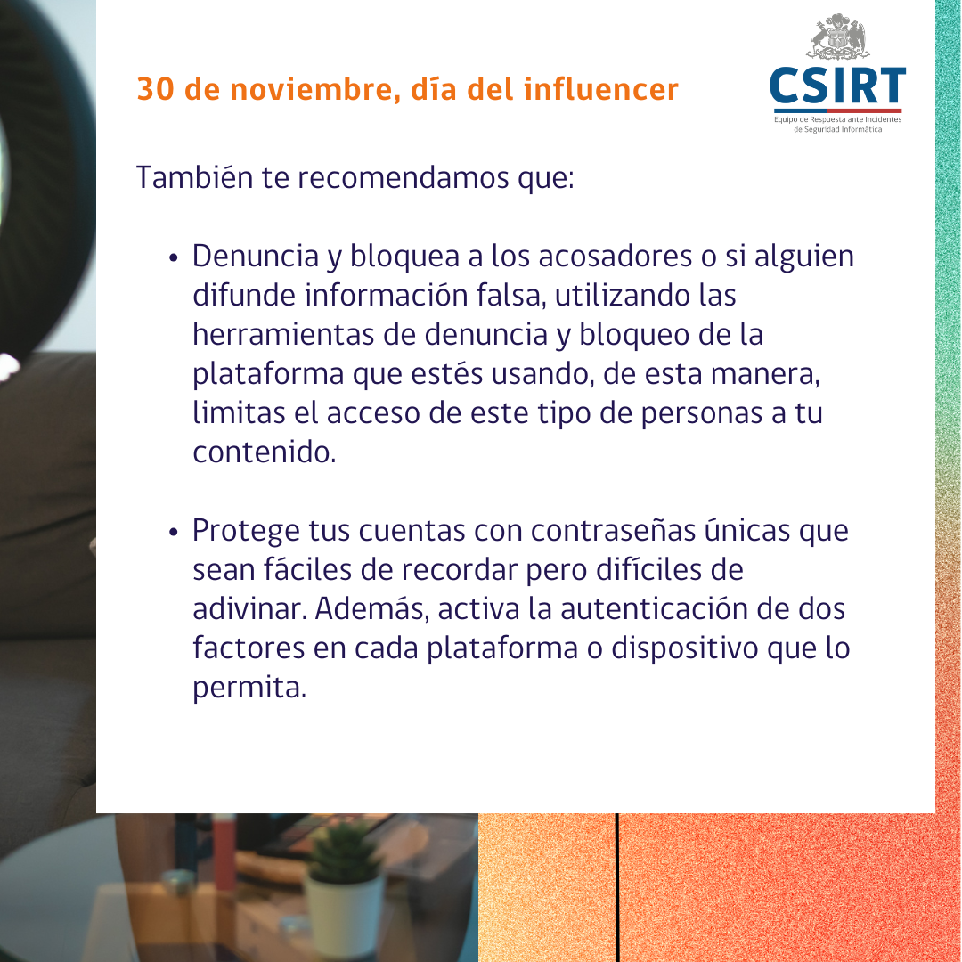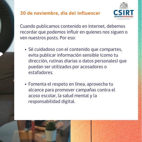 El 30 de noviembre se celebra el día del influencer, y queremos aprovechar de compartirles algunas recomendaciones. Porque seamos influencers o nos lean solo un par de seguidores, siempre debemos tener en cuenta los siguientes ciberconsejos al momento de publicar algo en internet, para hacerlo con responsabilidad y respeto y evitando entregar información personal que perjudique nuestra propia seguridad.