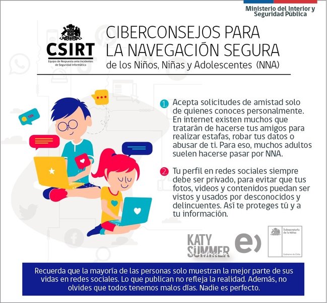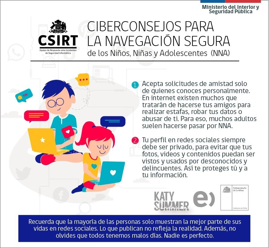 Internet abre un mundo inagotable de oportunidades, conocimiento, personas y cosas por descubrir. Pero también trae consigo riesgos, muchas veces difíciles de identificar incluso para usuarios adultos. Por eso debemos proteger a niños, niñas y adolescentes (NNA) en sus interacciones en línea, enseñándoles lo que se debe y no hacer al usar aplicaciones y navegar en la red. Con ese objetivo, recopilamos estas recomendaciones como CSIRT del Ministerio del Interior, la Subsecretaría de la Niñez y Entel, con ocasión de un nuevo Día del Niño.