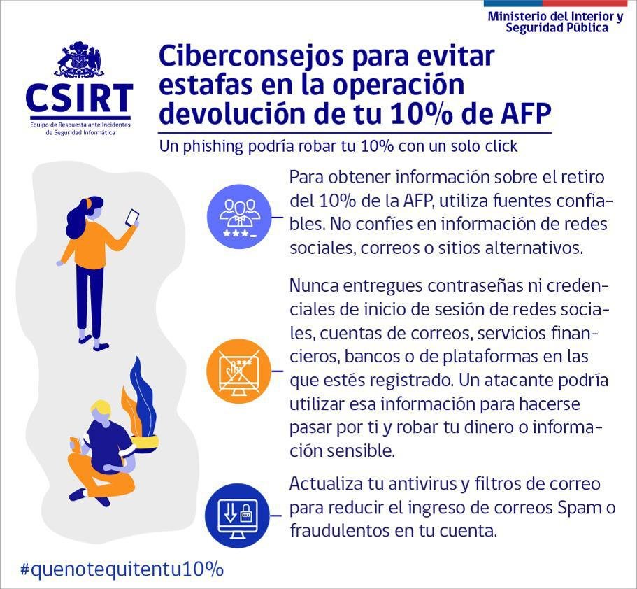Por eso, debes recordar ciberconsejos claves como realizar la solicitud del retiro directamente en el sitio web de tu AFP, asegurándote de que la dirección en el navegador sea la real, y nunca iniciar trámites haciendo clic en emails o mensajes que recibas, menos aún si contienen mensajes alarmantes.