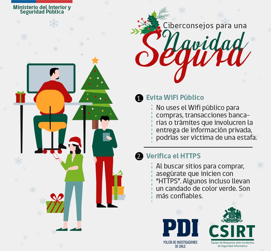 Con la llegada de diciembre, muchas personas ya comienzan a planificar sus compras navideñas. Si este año preferirás los canales digitales, el CSIRT junto con la PDI prepararon los siguientes consejos para comprar de forma segura y así evitar ser víctima de alguna estafa o fraude cibernético.
