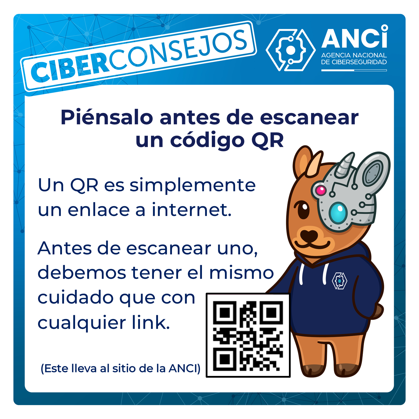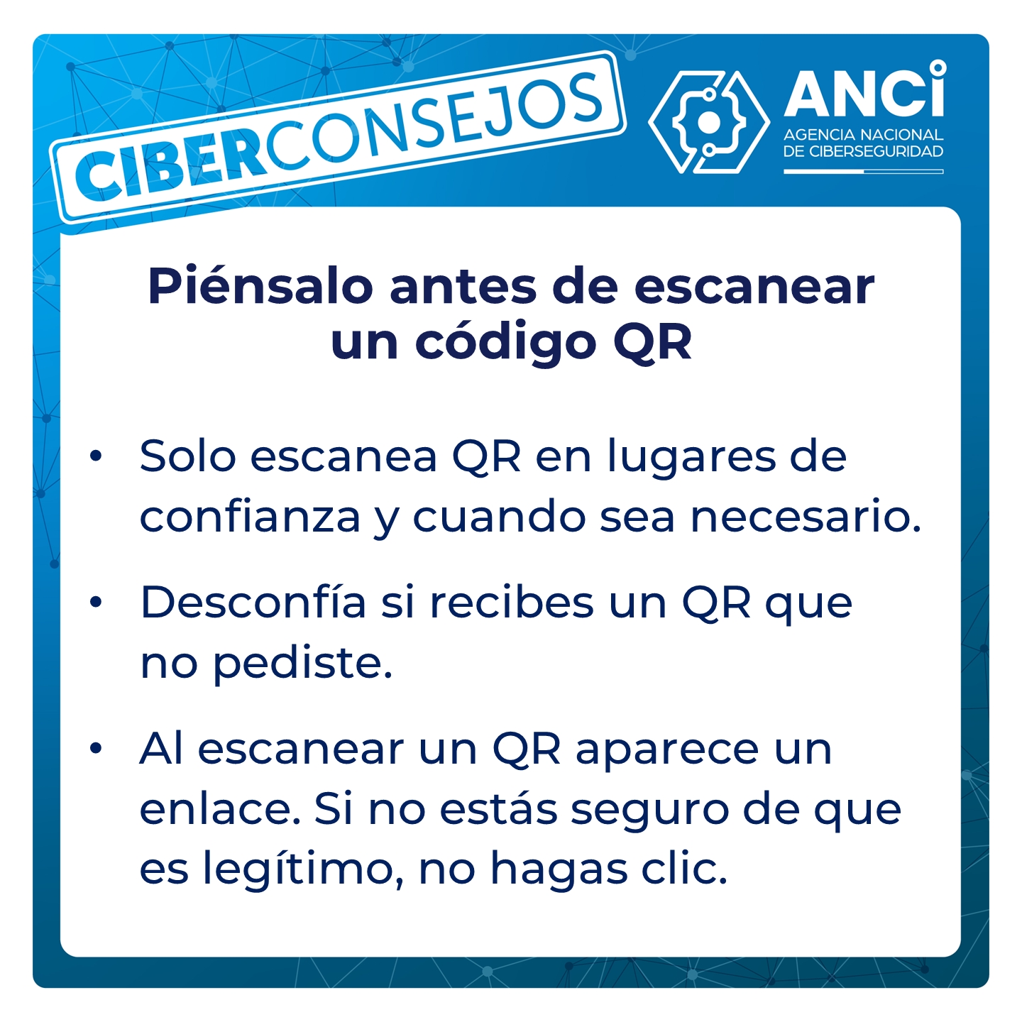 En los Ciberconsejos de la Agencia Nacional de Ciberseguridad (ANCI) de esta semana, les dejamos las principales precauciones que debemos tener al enfrentarnos a un QR.