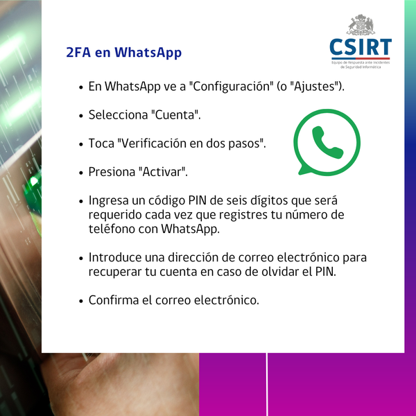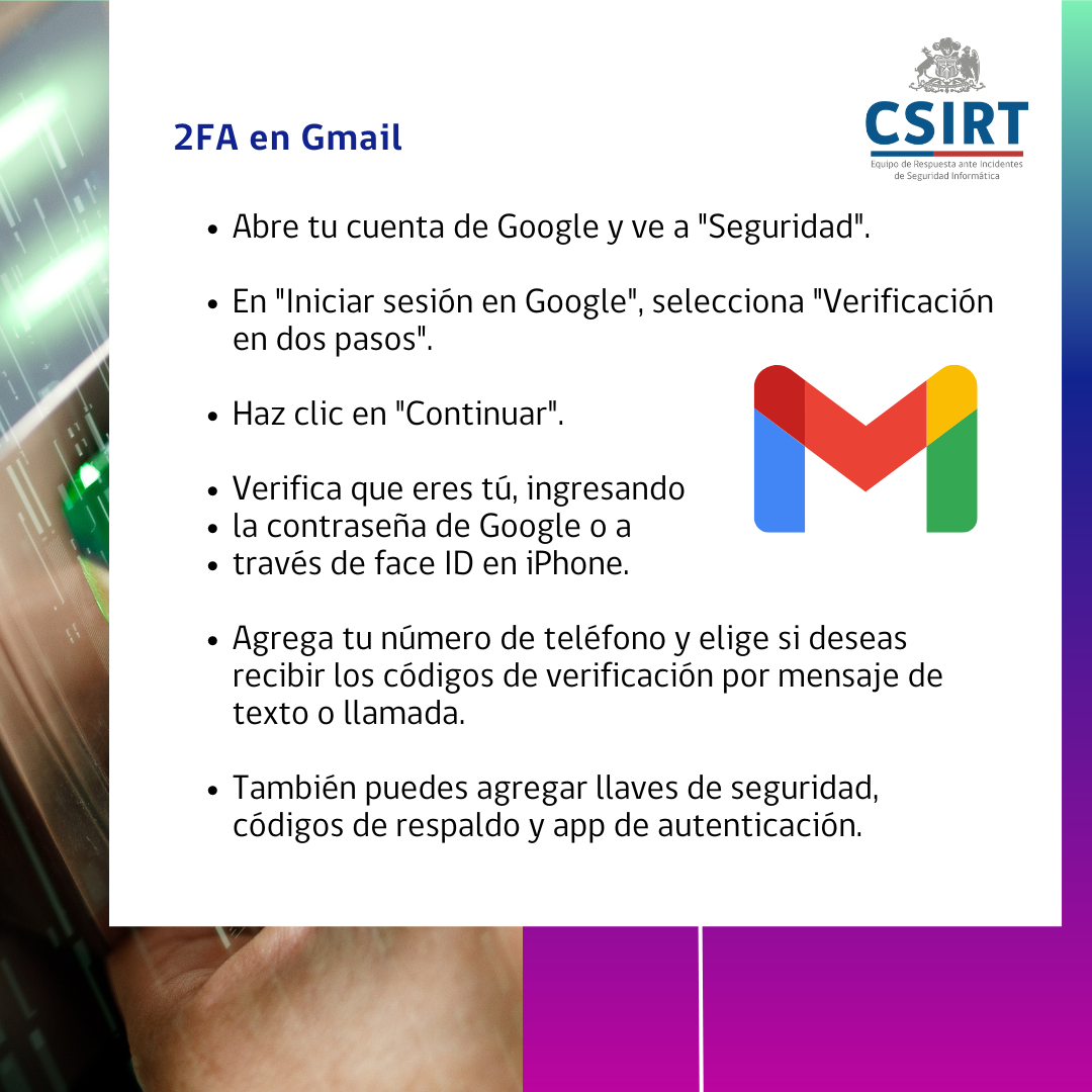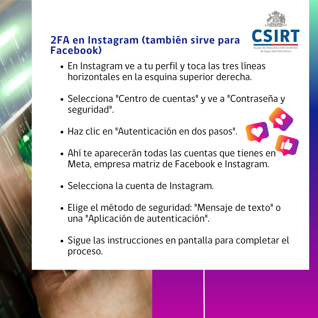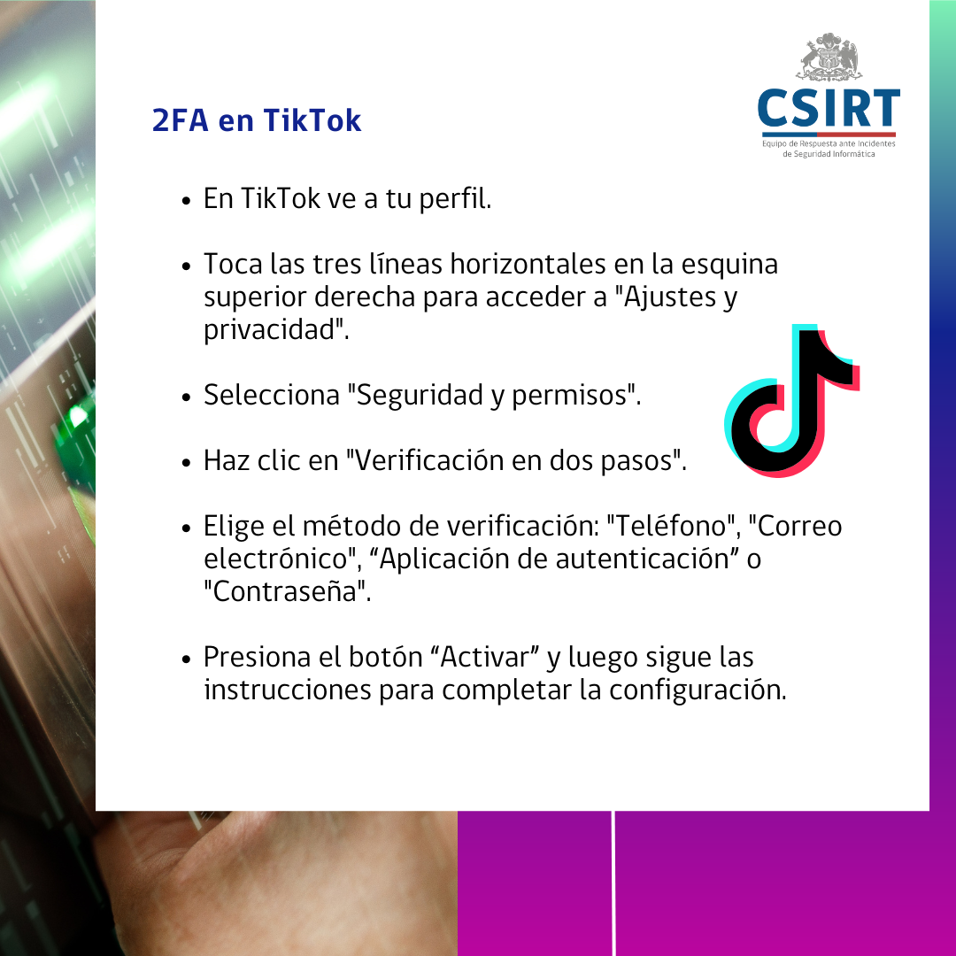 Como CSIRT de Gobierno te recomendamos activar la autenticación de dos factores (2FA) en las cuentas donde sea posible, y por eso decidimos compartir el paso a paso para realizarlo en Instagram, WhatsApp, Gmail y TikTok.
