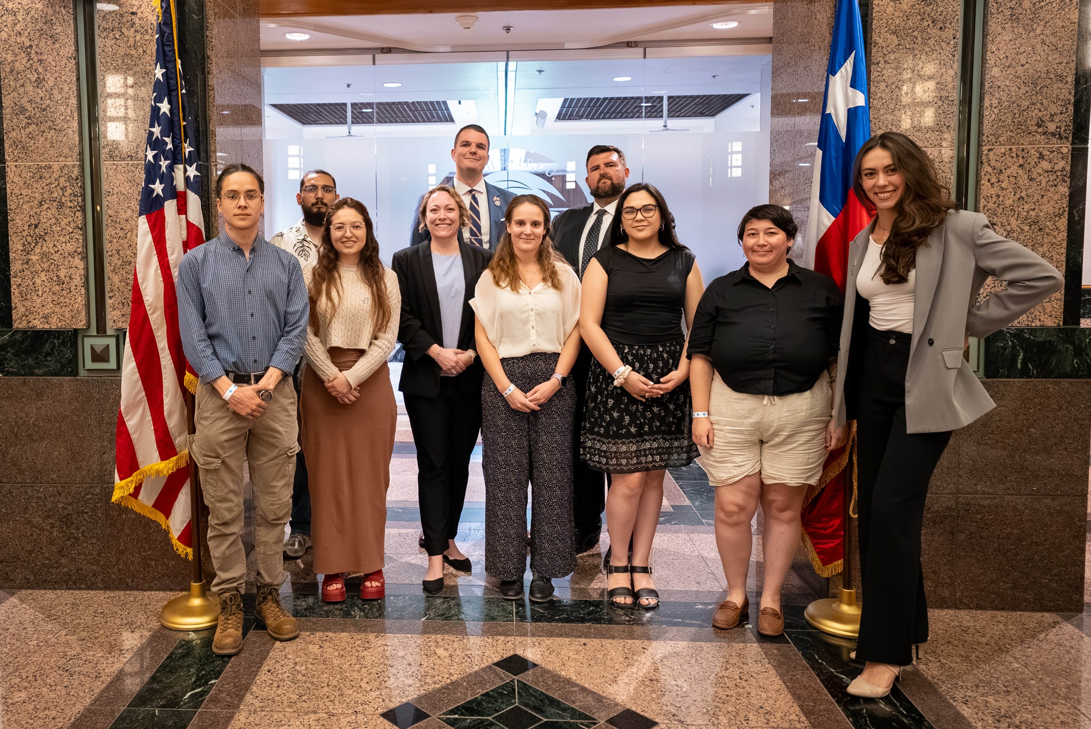 La delegación de la ANCI fue encabezada por la directora nacional (s) de la institución, Michelle Bordachar Benoit, al centro en la imagen, junto a Jennifer Moore (al lado de Bordachar, de chaqueta), de la Transportation Security Administration (TSA) y por CISA, Savanah Courtney (al extremo derecho de la foto), Christopher Brogger y Terrence Check (atrás, de izquierda a derecha).