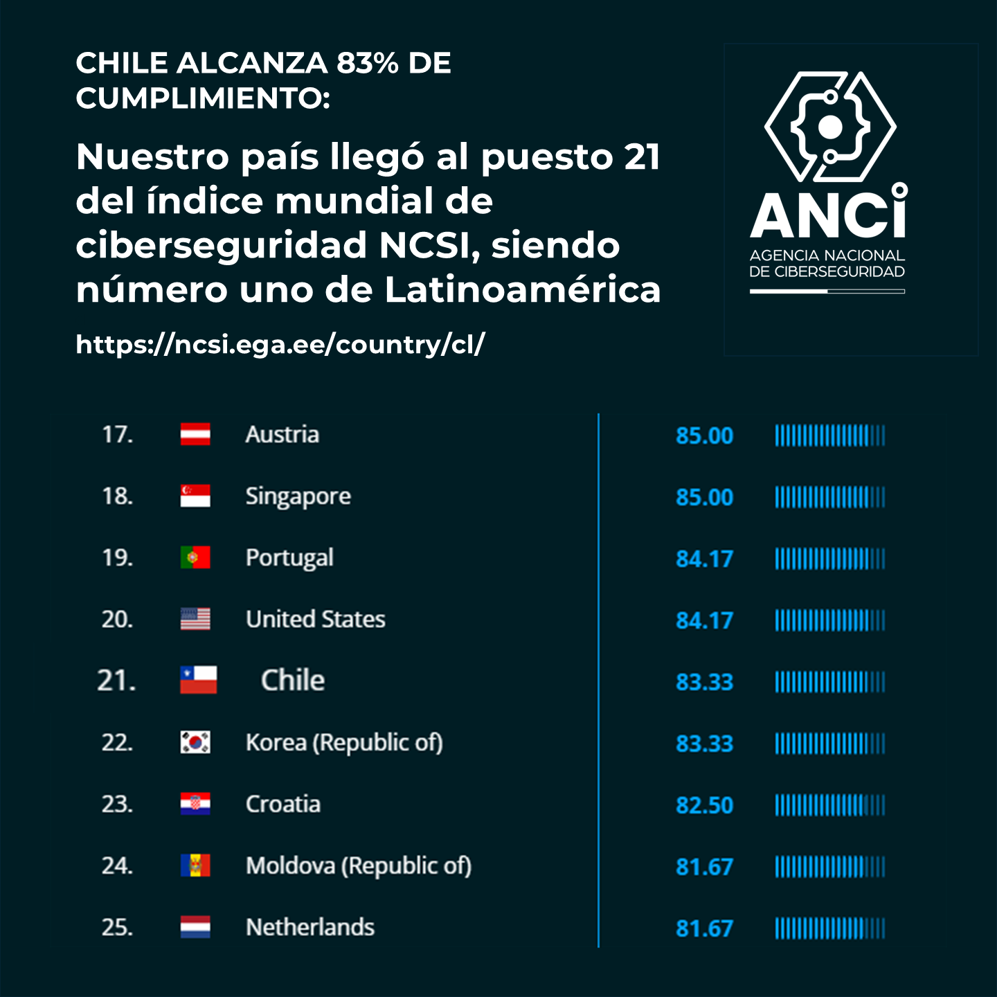Es importante destacar que en el índice NCSI los países son medidos de forma continua, pudiendo cada nación agregar evidencias del cumplimiento de alguno de los factores en cualquier momento, por lo que los cambios en el ranking pueden ocurrir de un día para el otro.