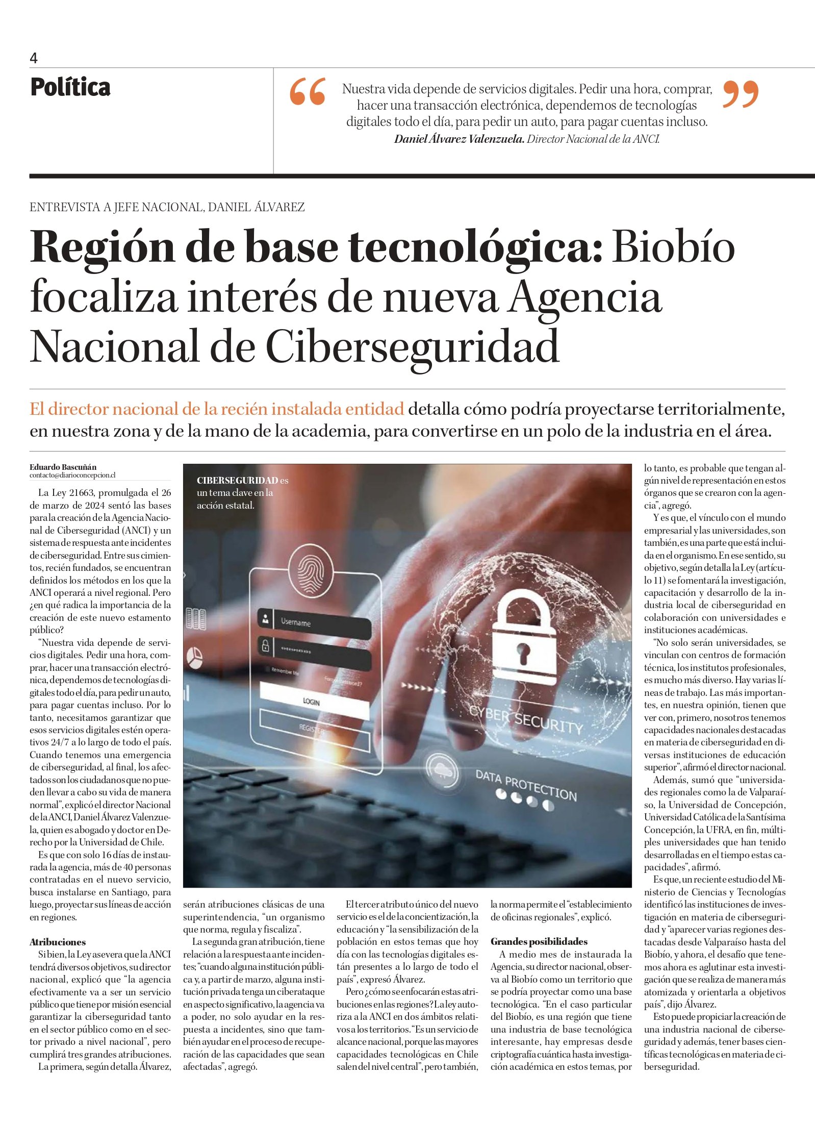 A medio mes de instaurada la Agencia, su director nacional, observa al Biobío como un territorio que se podría proyectar como una base tecnológica. “En el caso particular del Biobío, es una región que tiene una industria de base tecnológica interesante, hay empresas desde criptografía cuántica hasta investigación académica en estos temas, por lo tanto, es probable que tengan algún nivel de representación en estos órganos que se crearon con la agencia”, agregó.