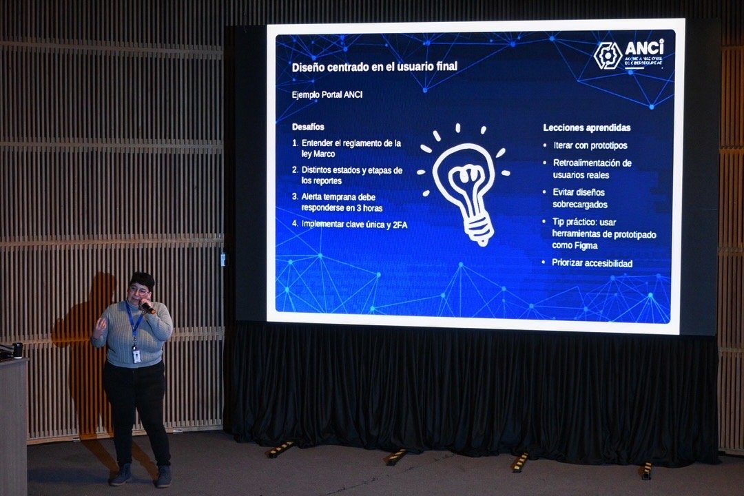 Catalina Vilches, profesional de la ANCI, describió la experiencia que vivieron en la Agencia al crear, en tiempo récord y con su equipo de expertas, el Portal ANCI, de reporte de incidentes de ciberseguridad. Hacer un sitio seguro, liviano y fácil de usar en distintos dispositivos fueron algunas consideraciones clave, explicó.
